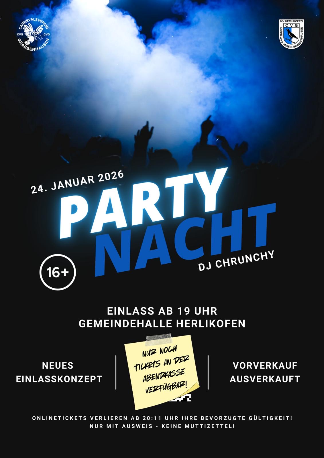 Alle Karten aus dem Vorverkauf für die Partynacht sind bereits vergriffen. Wir haben für euch aber noch ein Kontingent für die Abendkasse zurückgehalten. Also zögert nicht und kommt am 24.01.2026 zur Partynacht. Wir freuen uns auf euch!!!